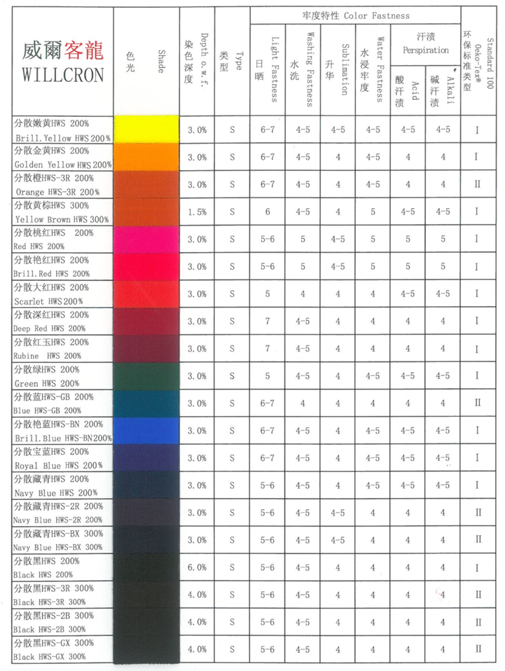 HWS 高标牢度型分散染料亲和力强,适用染色织物广,比如:涤纶、涤棉,涤氨、涤棉、涤纶、超细旦等。并且具有以下优越性: